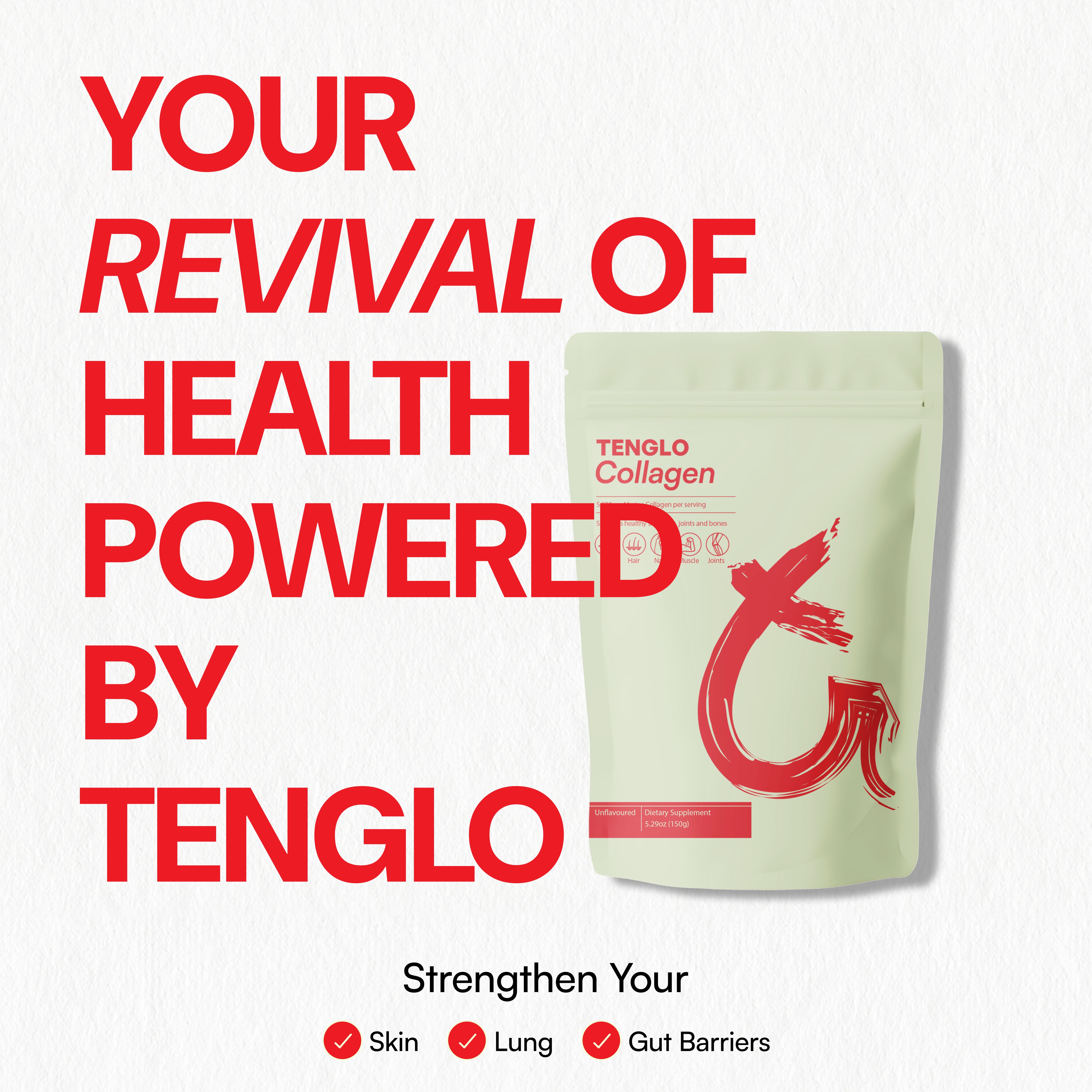 Gana partnered with Tenglo to develop a distinctive brand for a new collagen supplement entering the Indian market. The project included brand identity development, packaging design and social media communication. The brand story draws on Tenglo’s use of 100% Japanese marine collagen, translating this origin into a refined visual language. The result is a confident identity that combines Japanese visual heritage with contemporary supplement branding.